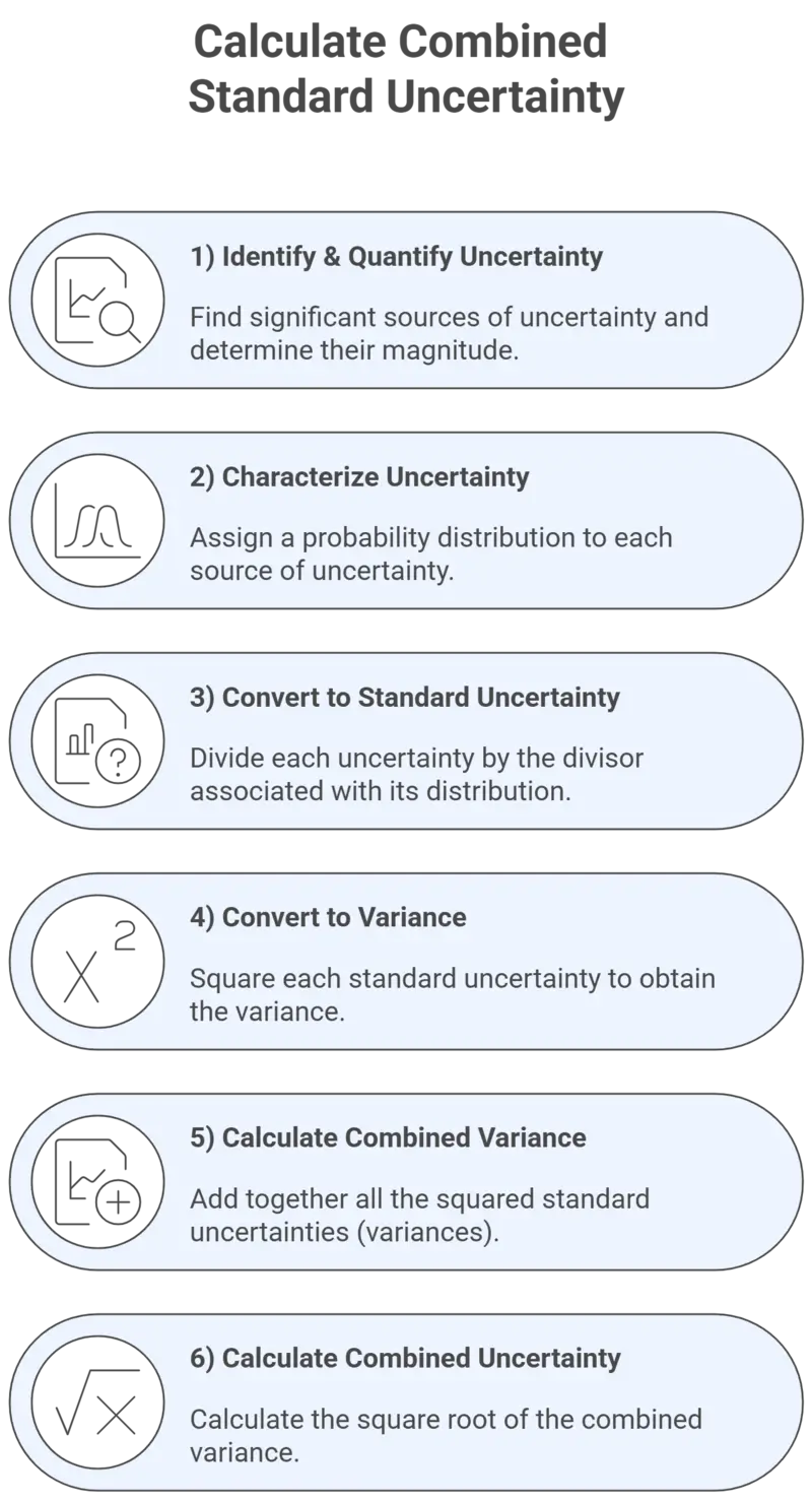 - Calculate the Combined Uncertainty – Calculate the square root of the combined variance
